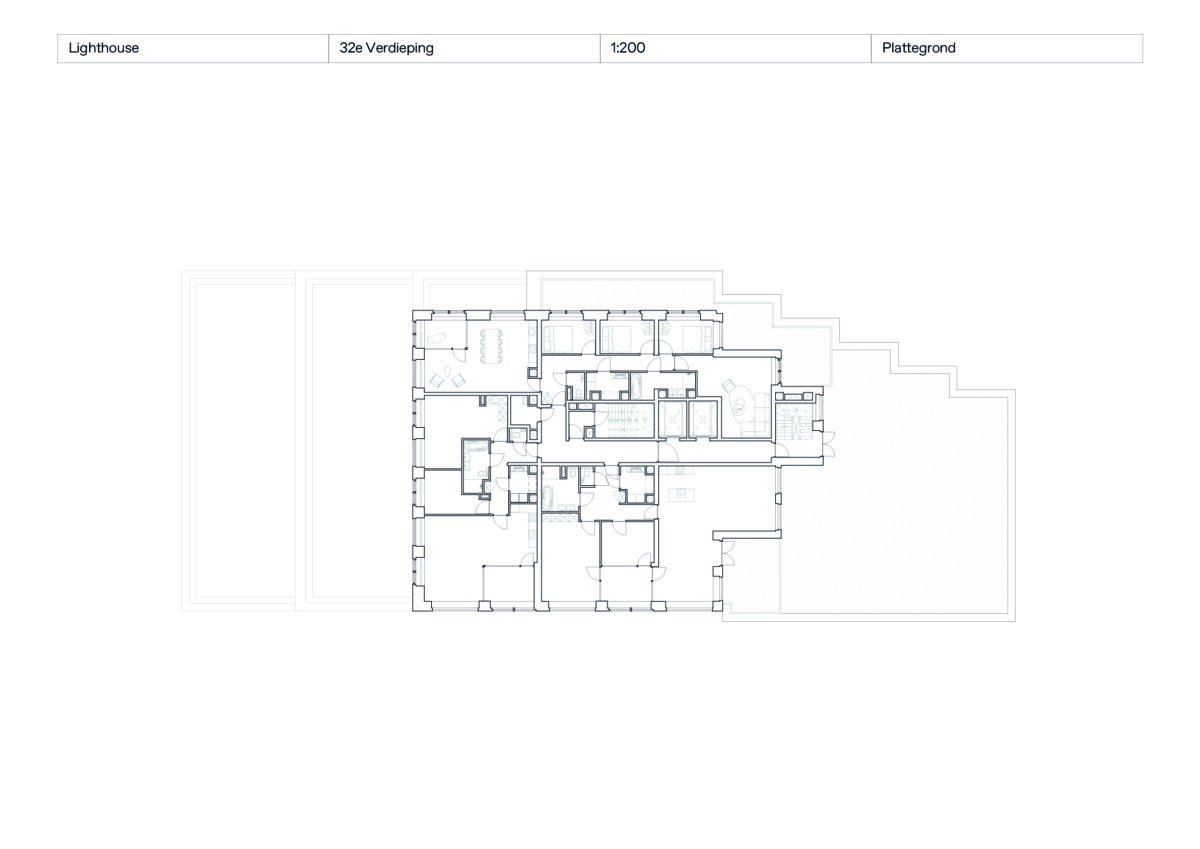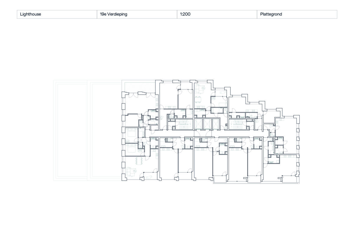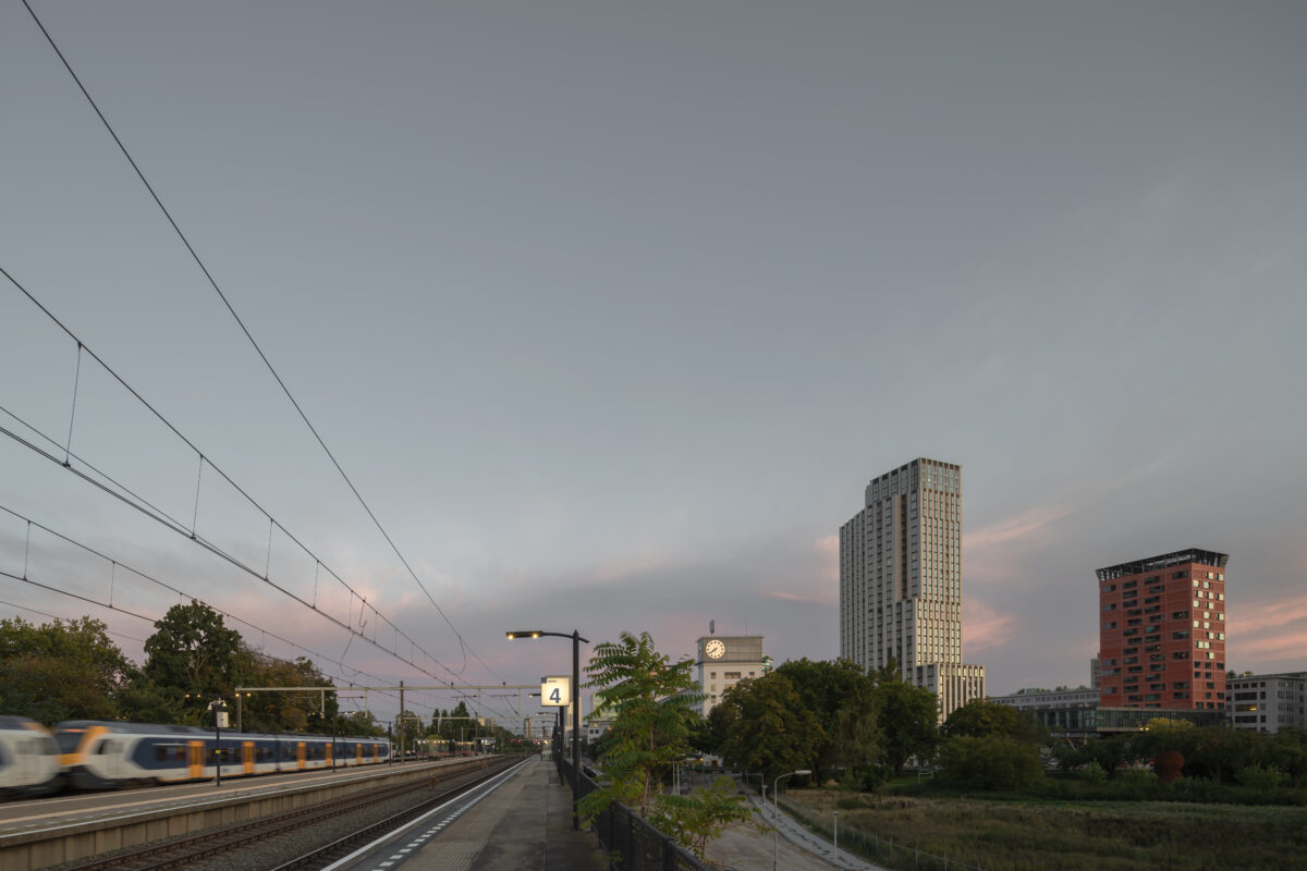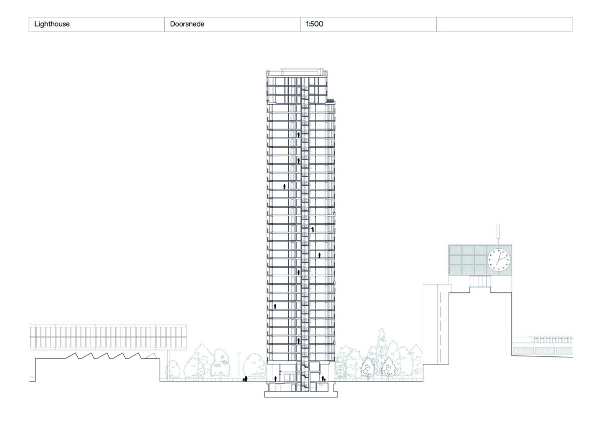 Lighthouse ragt 109 Meter über Eindhoven empor. Das vorläufig höchste Hochhaus der Stadt beherbergt 333 Mietwohnungen von 40 bis 110 m2 und neun Penthouses in den obersten drei Etagen. Der Sockel und die ersten beiden Etagen bieten mit gewerblichen und sozialen Nutzungen Raum für Dynamik.