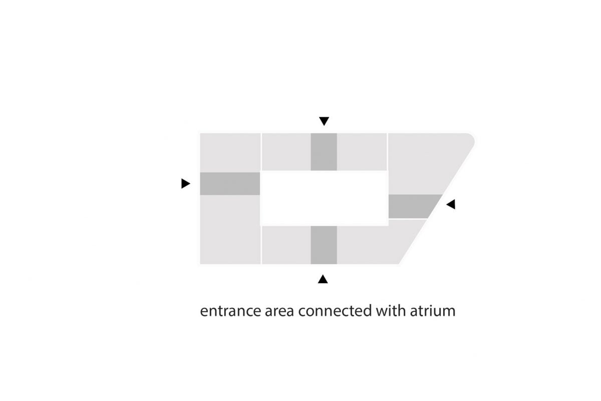 Centraal in het blok ligt een met glas overdekt atrium: een verticale binnentuin als collectieve ontmoetingsplek. Hier is ruimte voor gedeeld groen, een orangerie, moestuintjes langs de balustrades, zitplekken en boek- en spelletjeskasten. Familistère, met het atrium als groen kloppend hart, draait om bewoners samenbrengen, ontmoetingen en het vormen van een hechte gemeenschap.