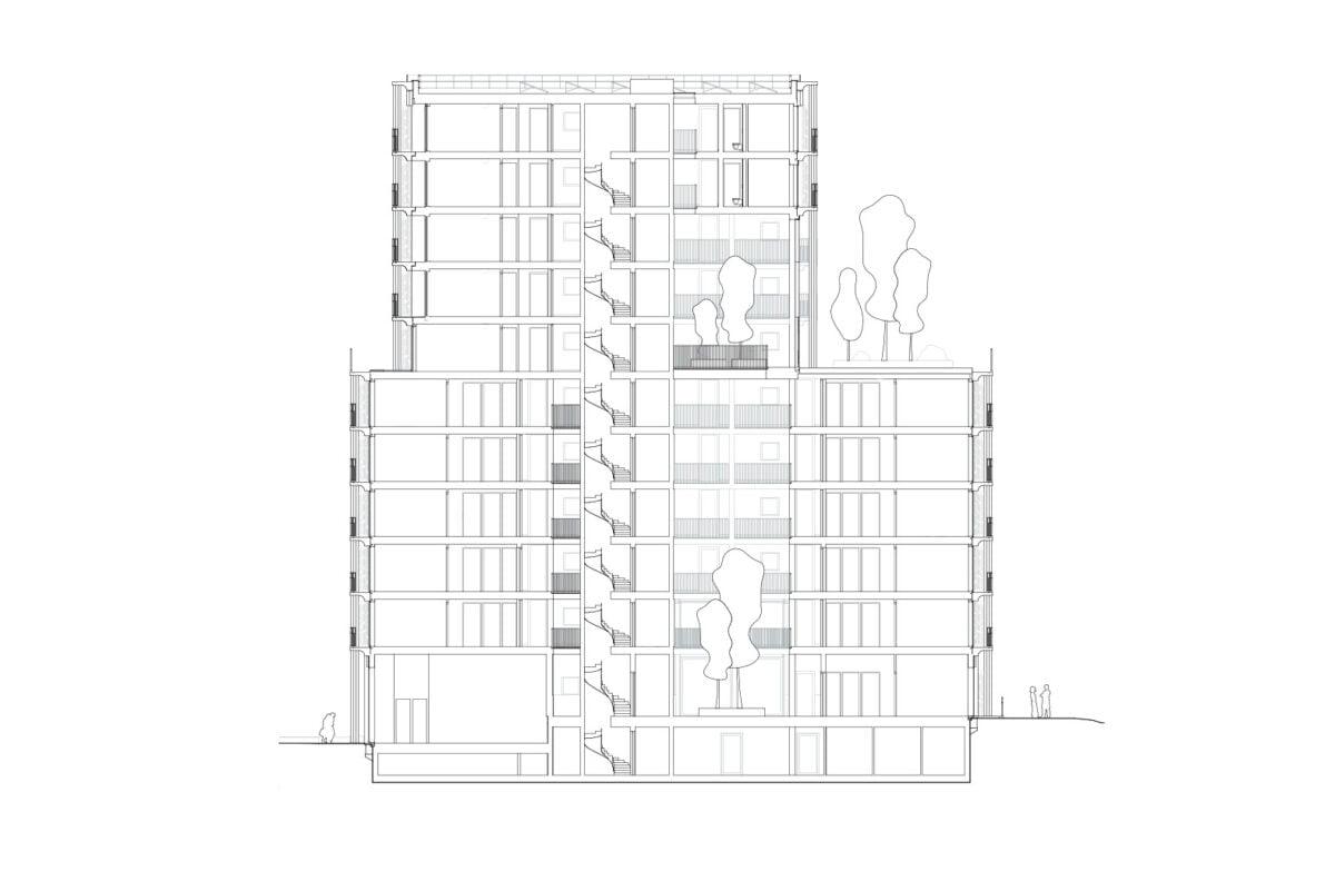 Het casco biedt ruimte voor woningen met slimme plattegronden, veel daglicht en royale binnen-buitenverbindingen via brede, doorlopende balkons met uitzicht. Dankzij doordacht ontwerp beschikt elke woning over een privé buitenruimte – een kwaliteit die het bouwbesluit niet vereist, maar hier bewust is toegevoegd.