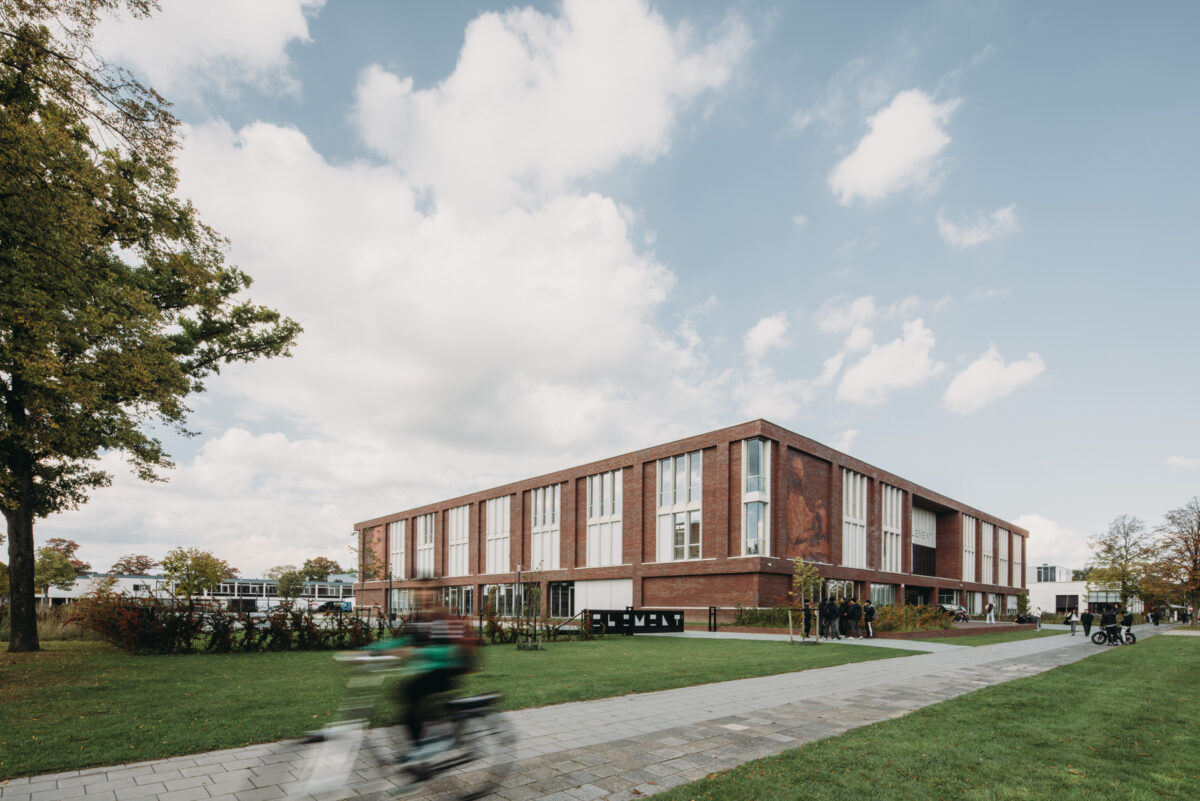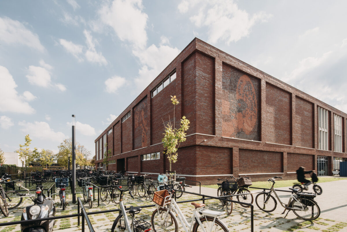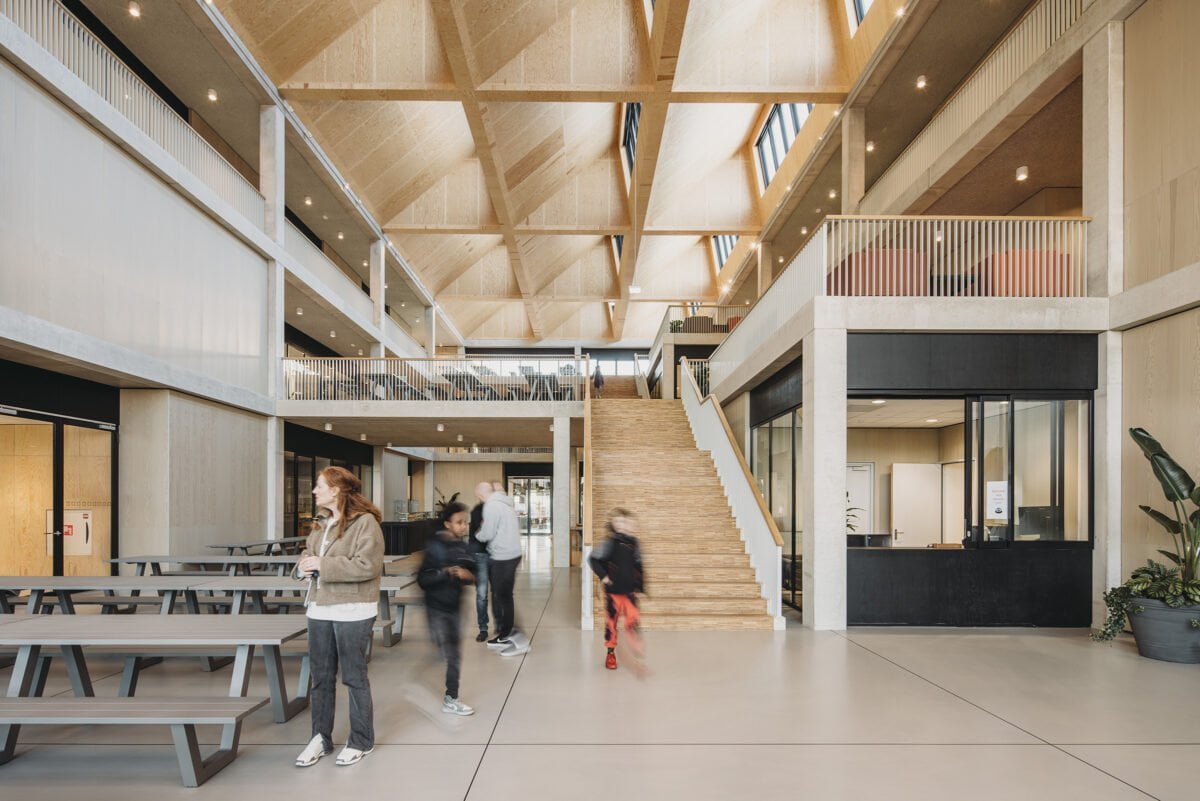 Het gebouw heeft een huiselijke sfeer met veel daglicht en een heldere, robuuste architectuur, waarbij gebruik is gemaakt van eerlijke materialen. De terreinindeling verbetert de buitenruimte met een verhoogd voorplein en groene zones rondom de school, wat de kwaliteit van de industriële omgeving aanzienlijk verbetert.