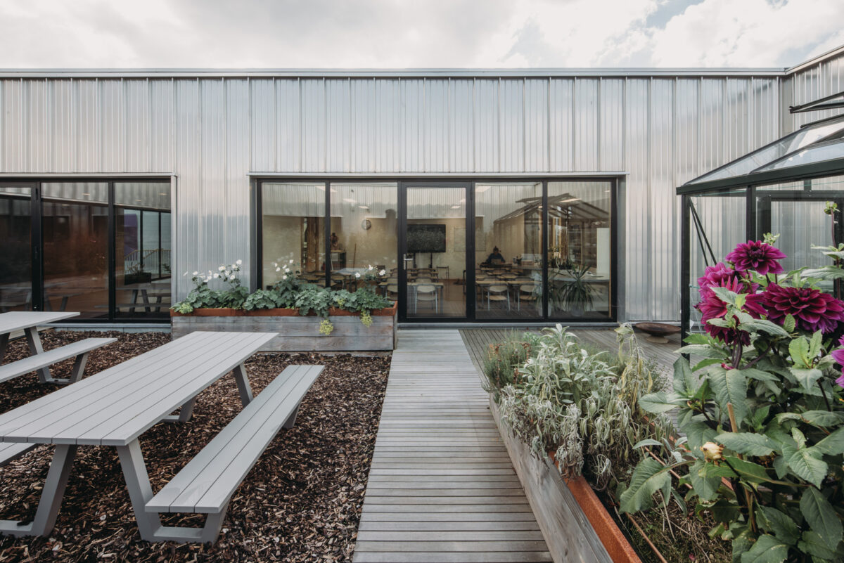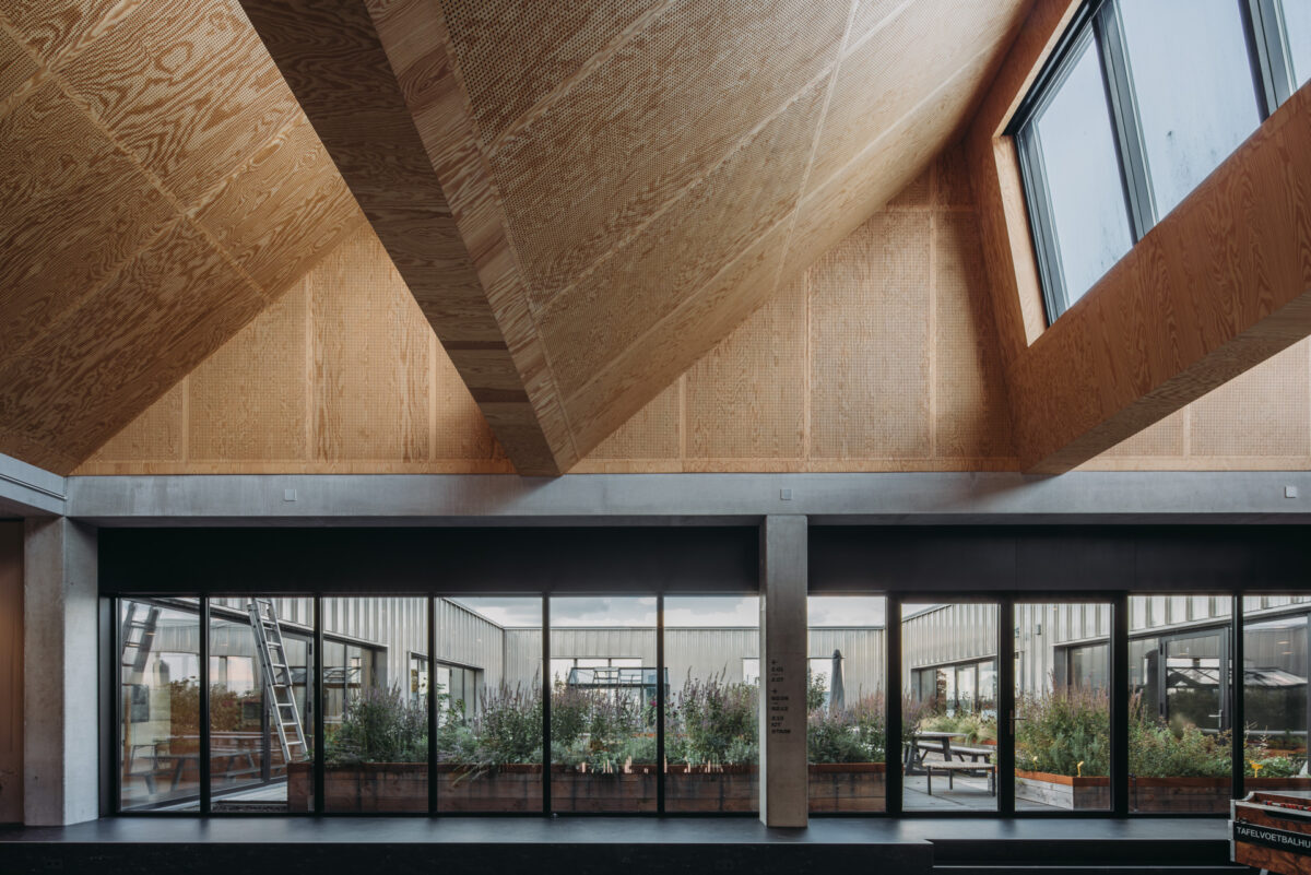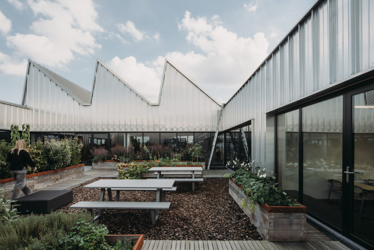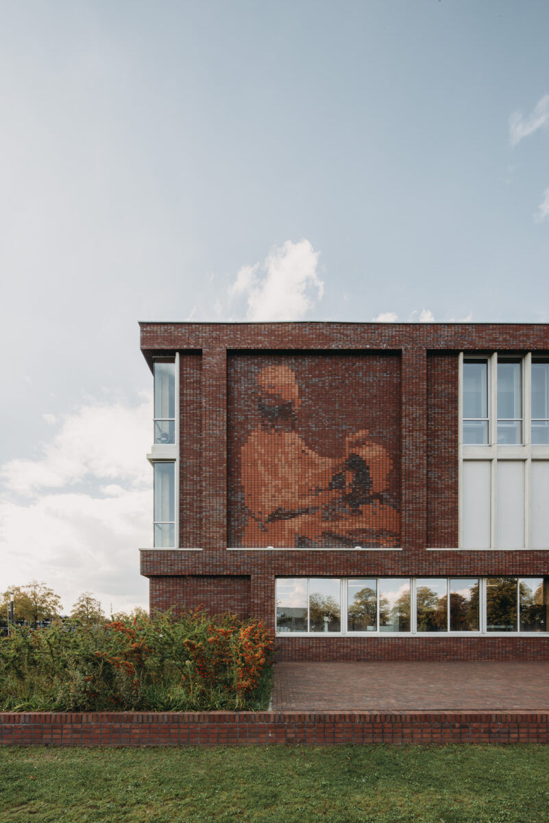 Het gebouw heeft een huiselijke sfeer met veel daglicht en een heldere, robuuste architectuur, waarbij gebruik is gemaakt van eerlijke materialen. De terreinindeling verbetert de buitenruimte met een verhoogd voorplein en groene zones rondom de school, wat de kwaliteit van de industriële omgeving aanzienlijk verbetert.